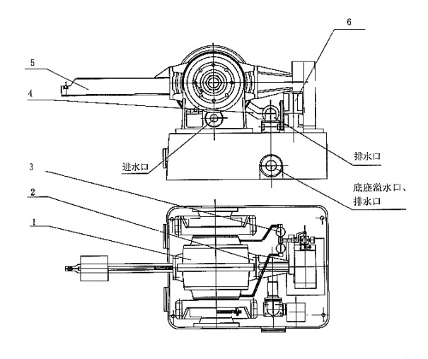 圖二(b)Y880-S、Y1900-S、Y3300-S水力測(cè)功機(jī)外形示意圖 1、機(jī)體部件 2、測(cè)功部件 3、潤(rùn)滑部件 4、進(jìn)排水部件 5、校正部件 6、自動(dòng)調(diào)節(jié)裝置部件